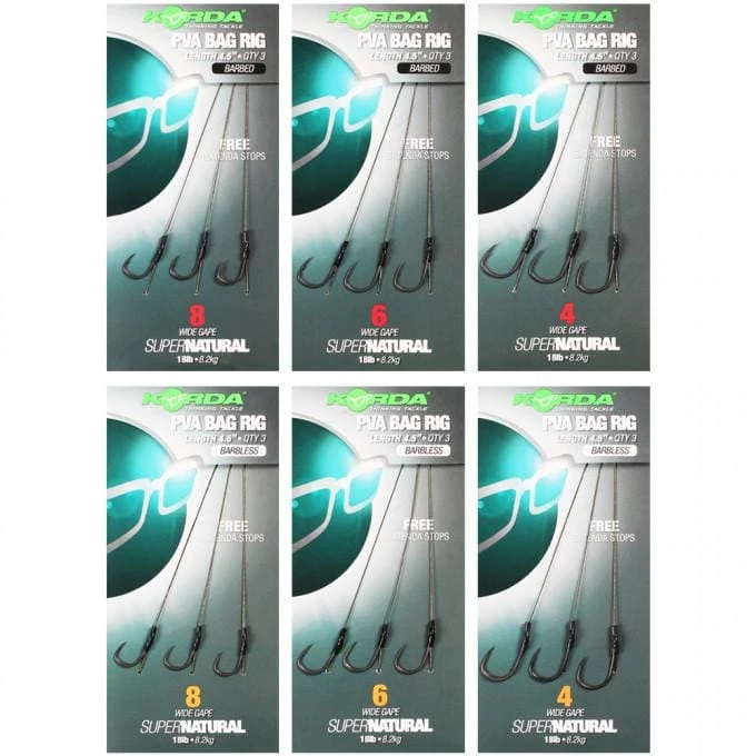 Korda Solidz PVA Rig has been designed for use with a PVA setup and can be attached to a lead system either with a loop-loop or a QC swivel. They come in packs of three, which is ideal for use with a standard three rod carp fishing setup, and are available in both barbed and barbless options. This means that you’ve got the perfect option to use on venues where fishing with barbed hooks is banned, as well as for when you want that little extra security that you’ve got a strong hold on your fish. There are three different hook sizes available in both the barbed and barbless options, the largest of which is a size four and the smallest a size eight.