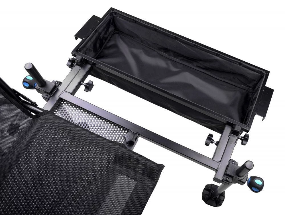 The barrow system features a large air tire (36 cm diameter) and 2 robust levers in the correct length, equipped with rubber handles. The barrow system is perfectly balanced and easy to steer, so that the walk over bumpy or soft surfaces is no problem at all. The included metal bait table offers space for numerous accessories and bait types in a horizontal position. Placed in a vertical position, this bait table forms a raised edge against which a bag or other items can be placed for safe transport.