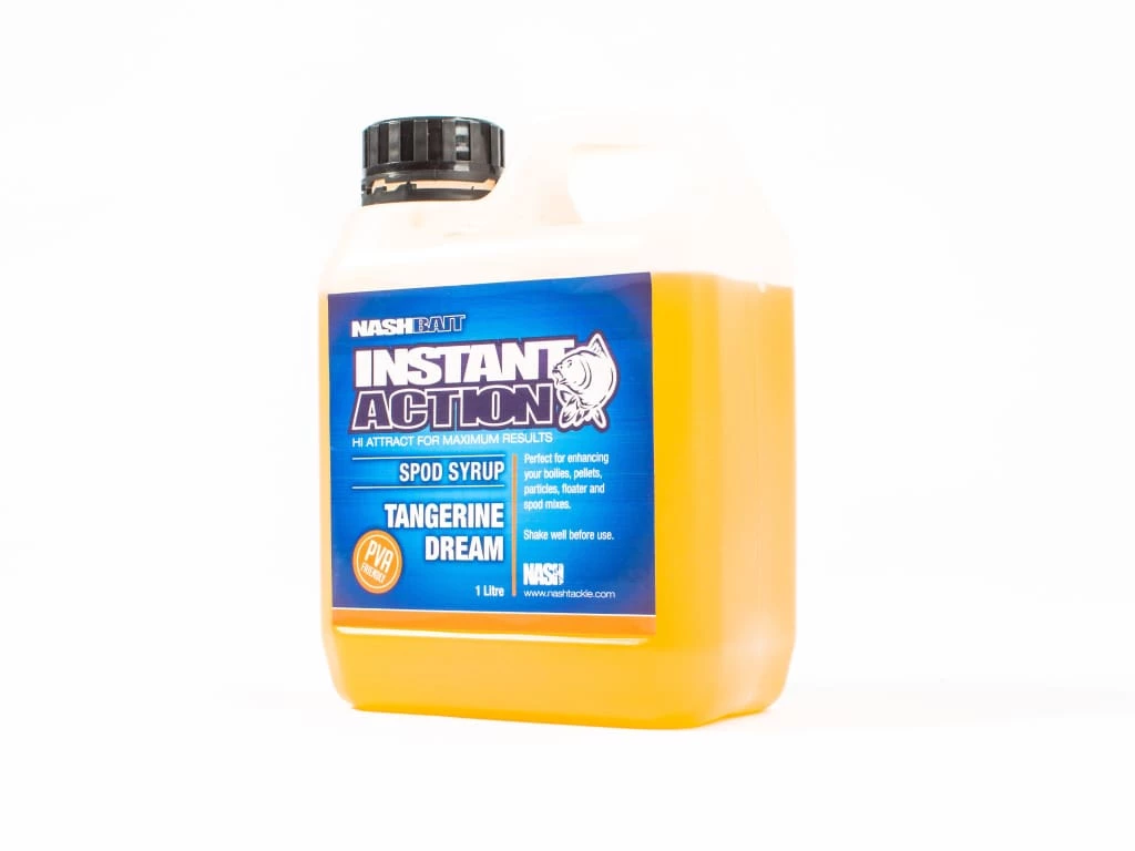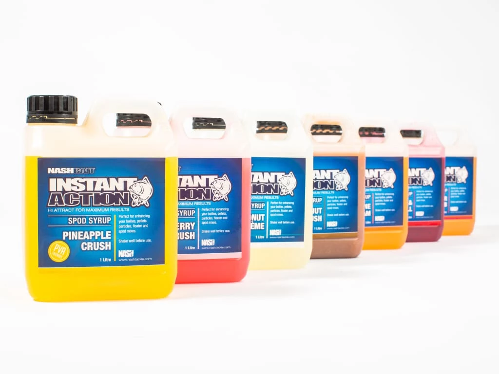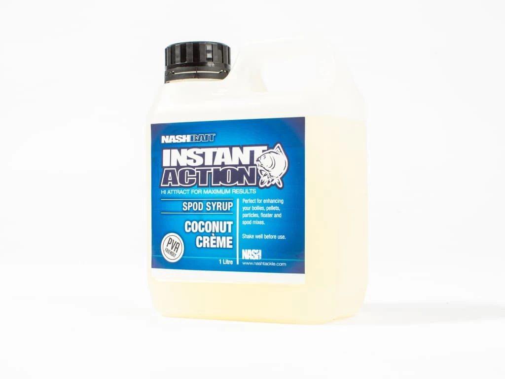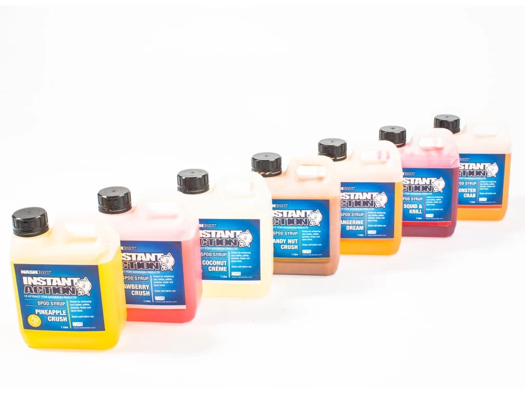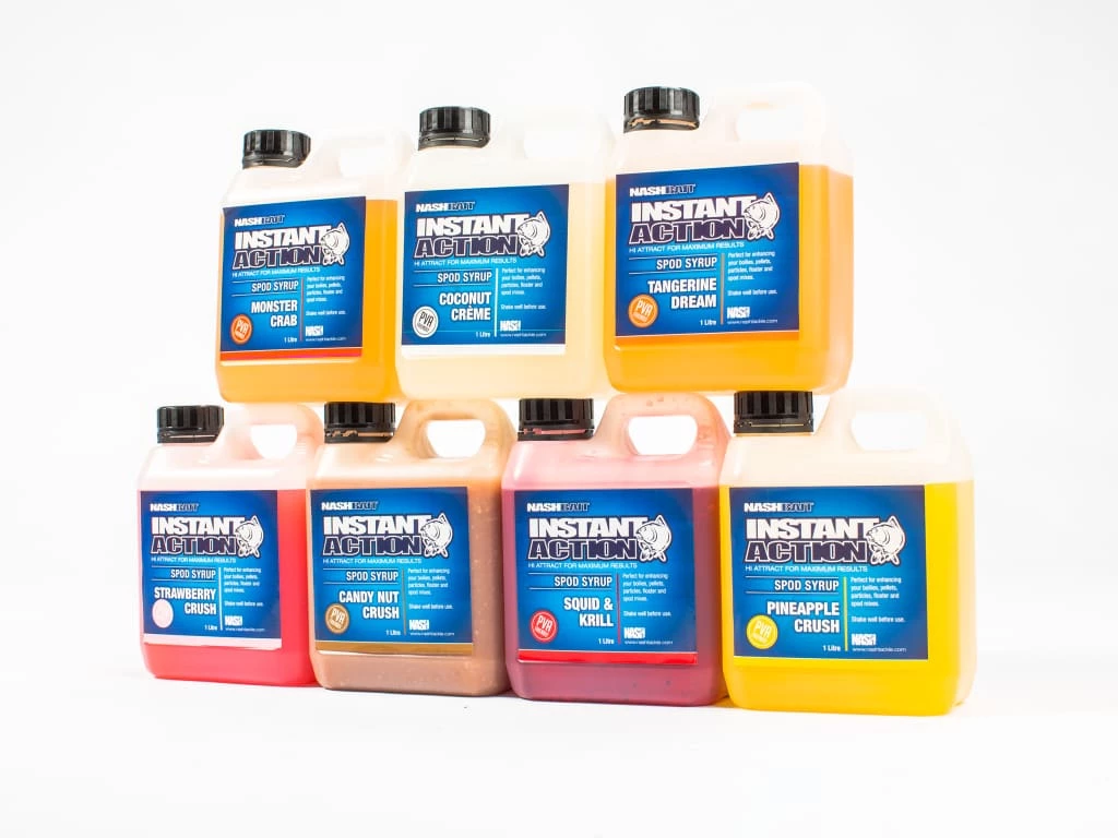 Nash Instant Action Spod Syrups combine food based constituents and oil based elements to ensure attraction at all levels and solubility in all temperatures, with two blended sweeteners to provide a rounded taste and improved cold water performance. 1 litre bottles.