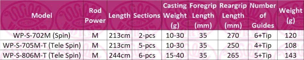 | Model | WP-S-702M (Spin), WP-S-705M-T (Tele Spin), WP-S-806M-T (Tele Spin) |