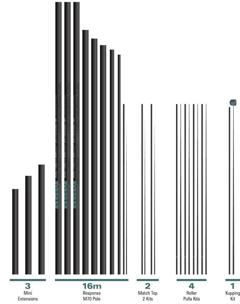 This pole is supplied with a combination of optimum length 2.4m match kits and Roller Pulla power kits that require no cutting back as all are pre-bushed with genuine Preston Innovations Slip Bushes, ready to fish.