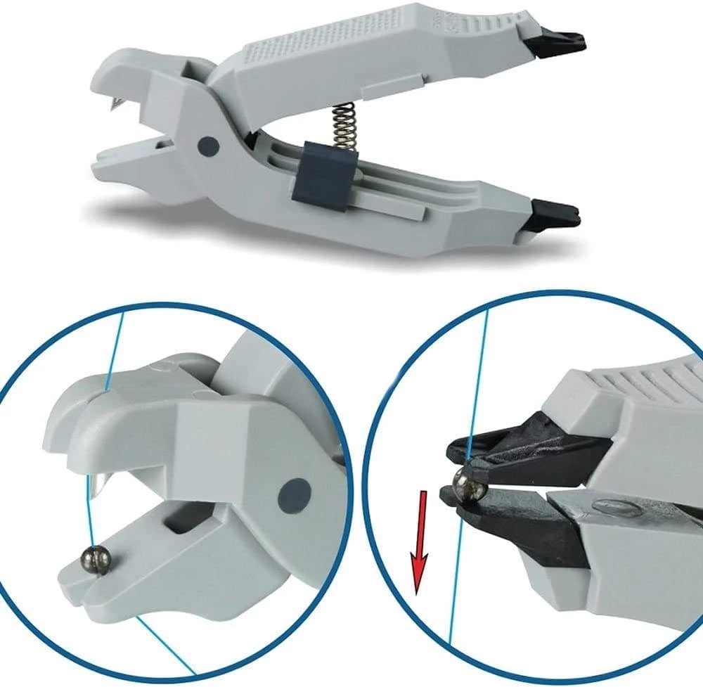 One end of the tool is used to remove all sizes of shot and the other end is used to slide shot without damaging the line. It also serves to tighten Style leads or shot on your line. slices through braid.