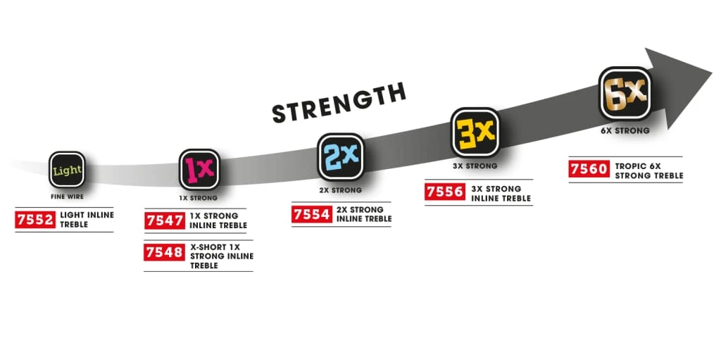 Built with VMC®’s latest extra-sharp ground Needle Point. Inline Treble hook for perfect balance. Extra wide gap. Also available in barbless version, see VMC – 7554B 2X-Strong Inline Treble Hooks (Barbless).